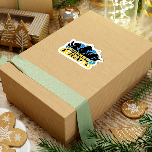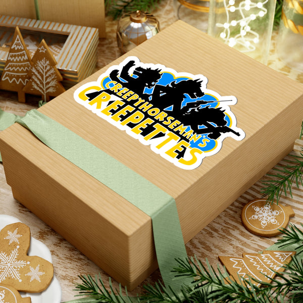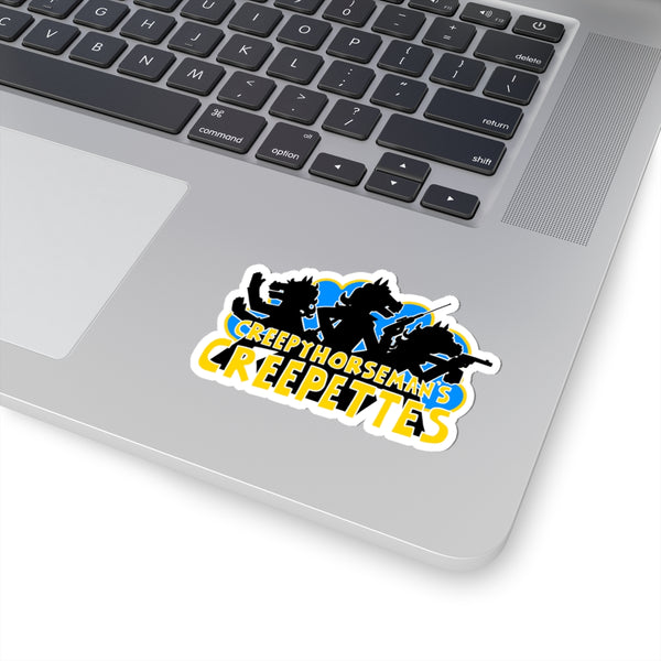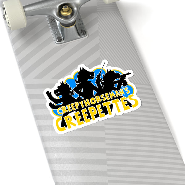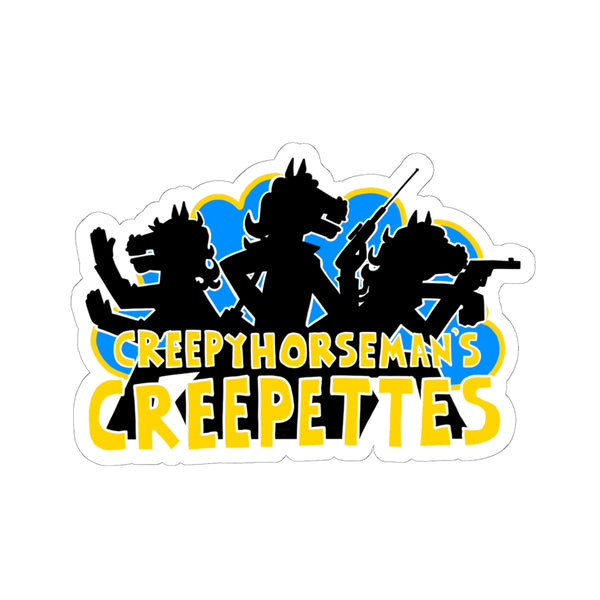 A bold, glossy kiss-cut sticker that channels retro cartoon energy with a darkly playful twist. The design features silhouetted characters in dynamic poses set against a bright yellow and blue backdrop, with chunky, vintage-style lettering that reads “Creepyhorseman’s Creepettes.” Printed on durable vinyl with a scratch-resistant glossy finish and vibrant eco-solvent inks, this sticker adds instant personality to laptops, journals, water bottles, and flat indoor surfaces. The peel-and-stick backing yields smooth, bubble-free application; choose white or transparent edge options and from four compact sizes to match your space. It’s crafted for adult collectors and fans who love offbeat, campy horror-humor art and want a long-lasting decorative accent.